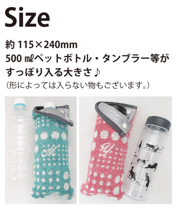 ご注文について ■サイズ ペットボトルカバー 11.5cm×24cm ■素材 綿100% 無撚糸使用(スリット糸使用) ■生地 ジャガード織、部分シャーリング加工 ■加工 抗菌防臭加工 刺繍・スワロフスキークリスタル装飾 ■生産国 生地=中国 加工=日本 ■複数枚のご注文方法 カラー・イニシャルが異なるごとに、個数を指定してお買い物かごに入れ、最後に購入手続きをしてください。